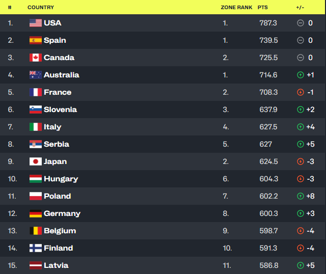 Srbija je na svetskoj listi trenutno osma sa 627 bodova. Naši nacionalni timovi u mlađim kategorijama su napravili napredak od pet mesta.